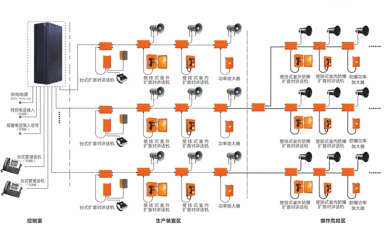 强芯科技有主机扩音对讲广播系统是根据工业企业生产环境和内部联络通讯的特点开发生产的一种具有具有单通道和多通道双方或多方双工通话、组呼、全呼、广播、分区合并分离、语音/警报、程控电话接入进行广播呼叫和对讲等多功能的内部联络通讯系统。